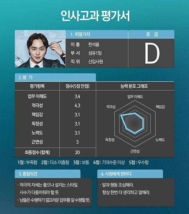 부서 안 분위기 메이커 역할을 잘 수행할 것이라는 의견이다. 밝지만 지나치게 가볍지도 않은 성격으로 조직 적응력이 빠를 사원. 적극성도 좋아(4.3점) 무슨 일이든 능동적으로 처리할 듯하다. 하지만 여러 사람과 격의 없이 지내면서 친한 듯 안 친한 듯 애매한 관계에 놓이는 동료들이 많을 것으로 보인다. 통통 튀는 성격 탓에 다소 근면성(3점)이 떨어지는 사람으로 비춰지기도 한다. "성과로 말합시다, 한석율씨 등급은 D. 저녁에 소주나 한 잔 하지~"