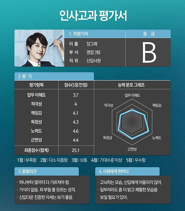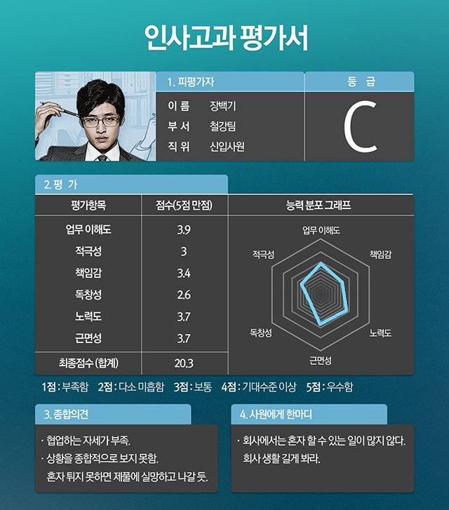 장그래는 상대적으로 초라한 스펙을 지닌 고졸 출신 낙하산이다. 사실 이런 사원은 애초에 합격이 불가능하다는 것이 중론. 파격적 고용인 만큼 시기를 많이 사 동료들과 융화되기 어려울 것이란 의견이다. 업무 능력도 부족해(업무이해도 3.7점) 하나부터 열까지 다 가르쳐야 하는 부담이 따르는 사원. 하지만 신입답게 충실히 배울 마음가짐(근면성 4.4점·노력도 4.6점)이 돼 있는 만큼 가르치는 보람도 느끼게 해줄 사원이다. 올해의 등급은 아쉽지만 B.