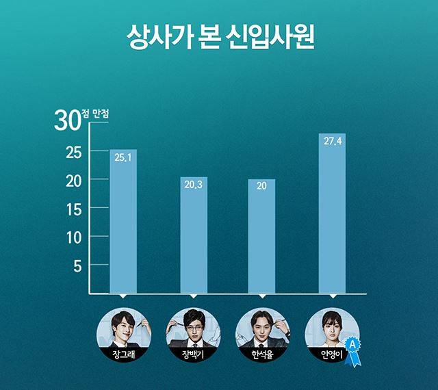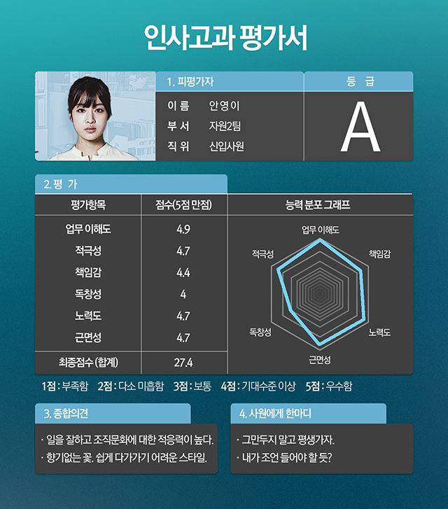 업무 능력(업무이해도 4.9점)은 물론이고 성격도 좋다. 여기에 성실한(근면성 4.7점·노력도 4.7점) 태도까지, 그야말로 최고의 신입사원이다. 상사는 안영이가 퇴사할까봐 조마조마할 듯. 다만 바로 윗 선배들에게 위협적인 존재로 비춰질 가능성이 높다. 가끔은 틈을 보일 필요가 있다. 하지만 당신은 에이스. 만장일치 A등급.