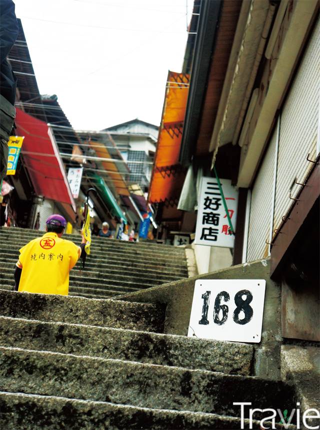 곤피라 신사 본궁까지 이르는 785계단을 오르는데 365계단까지는 좌우로 상점가가 이어진다