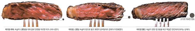 고기에 열을 가하면 가장 먼저 지방이 분해되고 휘발성 물질이 날아가면서 고소한 냄새가 난다. 단백질도 엉겨 붙으면서 메일라드 반응(색깔이 갈색으로 변하는 현상)을 보인다. 고기의 맛은 지방의 고소한 첫맛, 단백질의 구수한 끝맛으로 좌우된다. 미디엄은 이 둘의 조화가 가장 잘 이뤄진 상태다. 미디엄 레어는 모든 스테이크 셰프가 이구동성으로 추천하는 최상의 굽기 정도다. 고기 본래의 육즙을 최대한 느끼면서 육질 또한 부드럽게 먹을 수 있기 때문이다. 미디엄 웰던은 고기가 뻑뻑한 단점은 있지만 열처리된 지방과 단백질 특유의 맛을 느낄 수 있다.