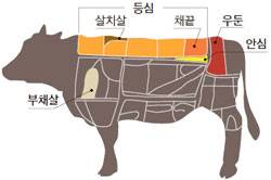 ▶채끝살 : 등심이 끝나면서 우둔살로 가는 부위. 소를 몰 때 휘두르는 채찍의 끝이 닿는 부분이라고 해서 '채끝살'로 불린다. 마블링이 등심보다 적지만 육질이 탄탄해 구웠을 때 씹는 맛이 좋다. 가격은 등심보다 싸다.