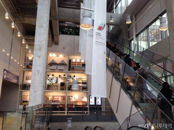 입구에 들어서면 우선 에스컬레이터를 타고 맨 꼭대기 층까지 올라가야 한다. 에스컬레이터를 3번 갈아타는 동안 건물 사이사이 이케아 제품이 전시된 작은 쇼룸이 마련돼 있다.