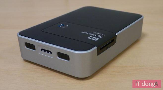 제품의 외형을 좀 더 자세히 살펴보면 외부전원의 연결 없이 배터리로 제품을 켤 때 쓰는 전원 버튼, 그리고 와이파이 연결을 편하게 하기 위한 WPS 버튼이 달려있으며, 전원 및 와이파이 연결 상태를 표시하는 전원 LED 및 와이파이 LED가 달려있다. 여기까지 봐선 기존의 무선 외장하드와 크게 다를 바가 없다고 생각할 수 있지만, 여기에 더해 WD 마이패스포트 와이어리스는 SD카드용 슬롯도 함께 갖추고 있다. SD카드에 담긴 파일을 외장하드로 간편하게 옮기고자 할 때 유용한데, 주로 디지털카메라 이용자들에게 요긴할 듯 하다.