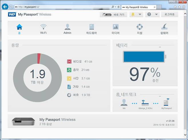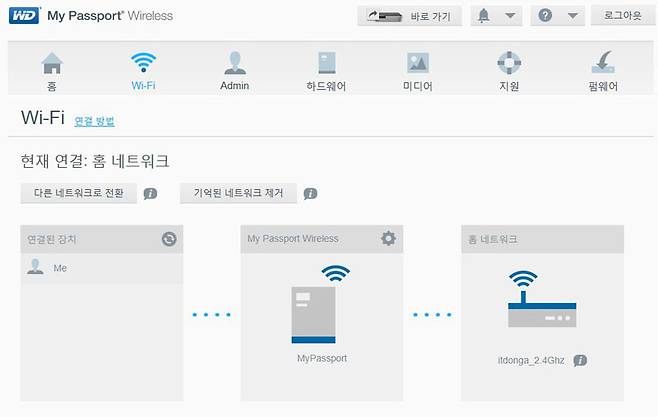 이를 이용해 '홈네트워크' 모드를 선택하면 마이패스포트를 경유해 PC나 모바일 기기가 외부 인터넷의 신호를 받을 수 있게 된다. 그리고 '핫스팟' 모드를 선택할 경우에는 WD 마이패스포트 와이어리스가 공유기처럼 와이파이 핫스팟을 생성, 최대 8대의 기기가 인터넷 연결 및 외장하드 파일의 공유가 가능하다. 다만, 대역폭(데이터를 전송하는 통로)의 한계가 있기 때문에 8대를 동시 이용하는 건 무리다. 실제론 2~3대 정도까지가 적절한 것 같다.