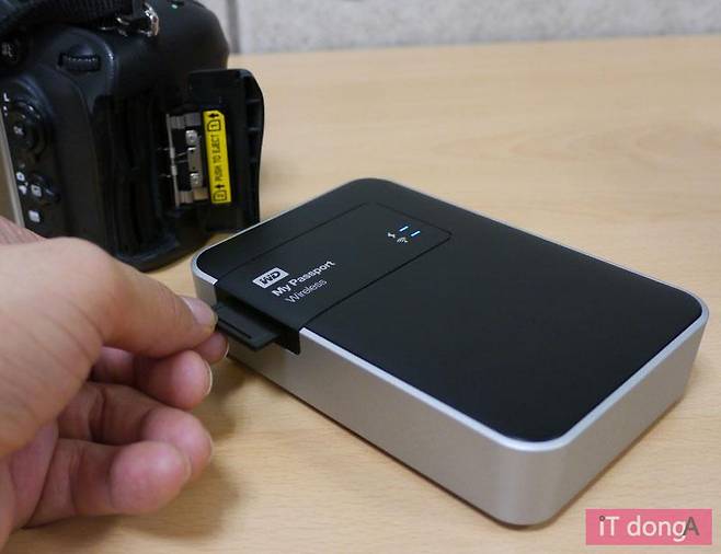 WD 마이패스포트 와이어리스의 또 다른 장기 중 하나라면 역시 SD카드 슬롯을 탑재하고 있다는 점이다. 이를 이용하면 PC를 거치지 않고 곧장 WD 마이패스포트 와이어리스에 SD카드를 꽂아 카드의 파일을 외장하드로 저장할 수 있다. 방법은 간단하다. SD카드를 꽂은 후 WD 마이패스포트 와이어리스의 WPS 버튼을 살짝 눌러주면 된다. 이렇게 하면 외장하드 내에 별도의 폴더를 만들어 그곳에 SD카드에 있는 모든 파일을 저장하게 된다.