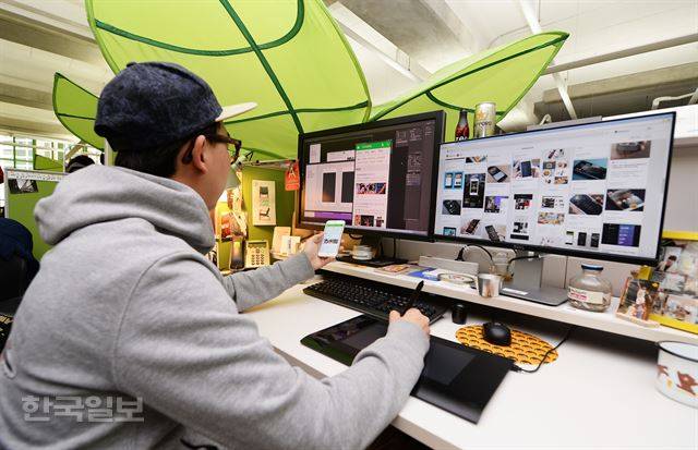 16일 성남 분당에 위치한 한 IT 기업의 앱 개발자가 사무실에서 컴퓨터(PC)를 보면서 스마트폰에 사용할 앱의 세부 기능을 테스트하고 있다. 한주형 인턴기자 (한양대 미디어커뮤니케이션학과 3)