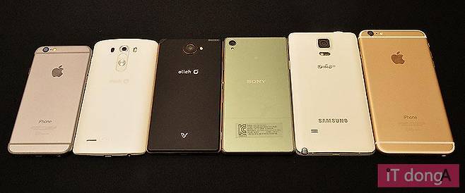 앞서 말했듯 비교 대상이 된 스마트폰은 아이폰6, 아이폰6플러스, 갤럭시노트4, G3, 베가아이언2, 엑스페리아Z3 등 6종이다. 최근 소비자의 관심을 받고 있는 각 제조사의 대표 스마트폰을 골랐다. 참고로 팬택은 베가팝업노트가 더 최신 모델이지만, 이는 SK텔레콤 전용이기에 최근 출고가 인하로 이슈가 된 베가아이언2를 택했다.