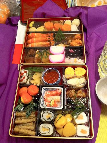 일본에서 설에 먹기 위해 준비하는 음식은 오세치다. 오세치는 오세치쿠(오섹쿠)가 변화한 단어로 신에게 공양하던 음식을 의미하며 설 외에도 일본의 5대 명절에 먹는 조림 요리를 지칭한다. 신년 설 기간에 취사를 하거나 소음을 내는 것은 경건하지 않은 것으로 보아 미리 만든 특별 음식인 오세치 요리를 먹는다. 오세치 요리는 3~5단의 찬합에 무, 연근, 우엉, 다시마, 콩, 새우, 밤, 청어알 등 다양한 재료를 달짝지근하게 조려서 보기좋게 담는다. 새우는 장수, 연근은 지혜, 밤은 재운, 청어알은 자손의 번성, 다시마는 행운 등을 의미한다.