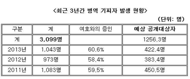 그럼 어떤 사람들이 심의 대상에 올라와 있을까요? 송영근 의원실을 통해 자료를 받아봤습니다. 먼저, 최근 3년간 발생한 병역 기피자는 3천 99명입니다. 연간 평균 천 명에 이르고 있습니다. 이 가운데 종교적인 신념으로 입대하지 않은 여호와의 증인을 제외하면 심의 대상이 된 병역 기피자는 평균 400명 정도라고 볼 수 있습니다.