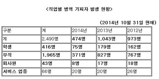 직업들도 궁금하실 텐데요, 역시 2013년의 경우 무직이 827명으로 가장 많습니다. 그 다음에 학생이 179명, 회사원은 17명, 서비스 업종은 20명이었습니다. 함께 보시라고 2014년 10월 31일 현재 기준으로 작성된 표를 첨부했습니다.