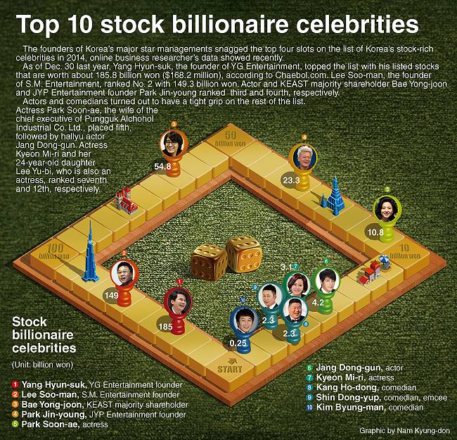 The founders of Korea’s major star management companies snagged the top four slots on the list of Korea’s stock-rich celebrities in 2014, an online business researcher’s data showed recently.