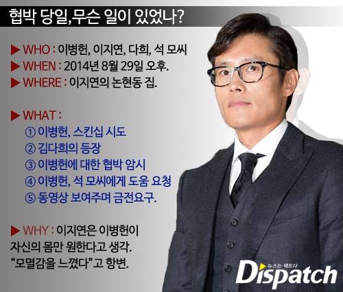 ▶ 8월 29일 :이병헌이 결별 선언 이후 다시 이지연을 찾음. 이지연과 김다희가 동영상 존재 밝힘. 음담패설 동영상을 보여주며 50억 원을 요구.