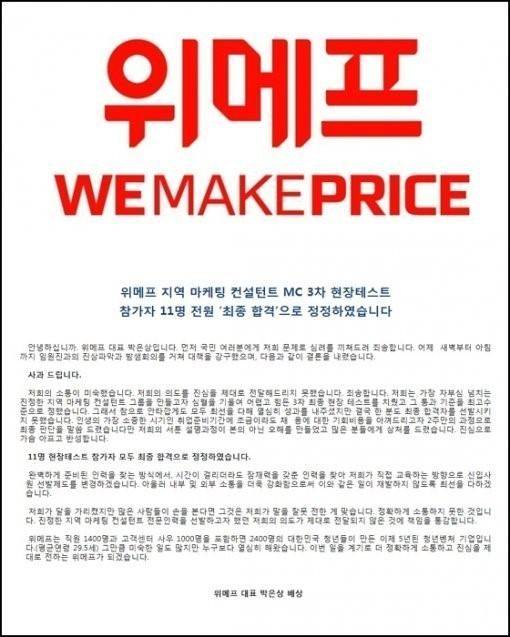위메프 박은상 대표는 공식 사과문을 통해 "자부심 넘치는 지역 마케팅 컨설턴트 그룹을 만들고자 통과 기준을 최고 수준으로 정했지만 소통이 미숙했다"며 "11명 현장테스트 참가자 모두 최종 합격으로 정정했다"고 밝혔다.