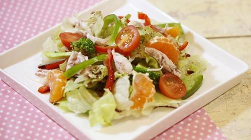 1. 닭가슴살은 끓는 물에 데쳐 체에 밭쳐 물기를 빼준다.2. 양상추는 먹기 좋은 크기로 잘라 찬물에 담가 신선도를 유지시킨다.3. 파프리카는 먹기 좋은 크기로 채를 썰고, 데친 브로콜리도 먹기 좋은 크기로 자른다. 방울토마토는 반을 갈라 주고, 귤은 껍질을 까서 알맹이를 분리해 준다. 다 식은 닭가슴살은 가늘게 찢어 준비해 준다.4. 큰 볼을 가지고 와 양상추와 채소와 과일을 수북하게 담고, 닭가슴살을 올린다. 마무리로 드레싱을 끼얹어 주면 완성이다.