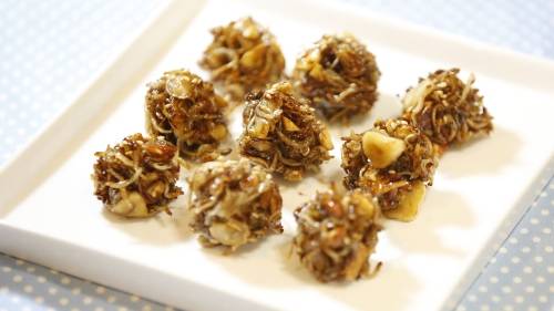 1. 달구어진 팬에 기름을 붓고 편 썰어둔 마늘을 볶는다.2. 마늘이 노릇해지기 시작하면 올리고당 4큰술을 넣어 함께 조려 준다.3. 잔멸치와 견과류도 함께 넣은 후 어느 정도 볶아지면 간장 1큰술, 통깨를 넣어 조려 준다.4. 수분이 완전히 날아갈 때까지 볶은 후 그릇에 펼쳐 열기가 식은 후 동그랗게 빚어 준다.
