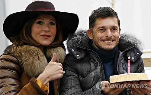 epa04559704 Italian racing driver Giancarlo Fisichella (R) holds a cake for his 42nd birthday next to his wife Luna Castellani (L) during the 87th Pitti Immagine Uomo at the Fortezza da Basso in Florence, Italy, 14 January 2015. The fashion exhibition of men's clothing runs from 13 to 16 January. EPA/MAURIZIO DEGL' INNOCENTI