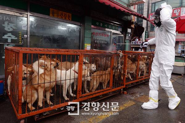 | 경기 성남시 모란시장에서 시판 중인 토종닭에서 고병원성 조류인플루엔자가 발견된 지난달 28일 보건소 직원들이 분무기로 시장에 있는 개 우리를 방역하고 있다. | 서성일 기자 |