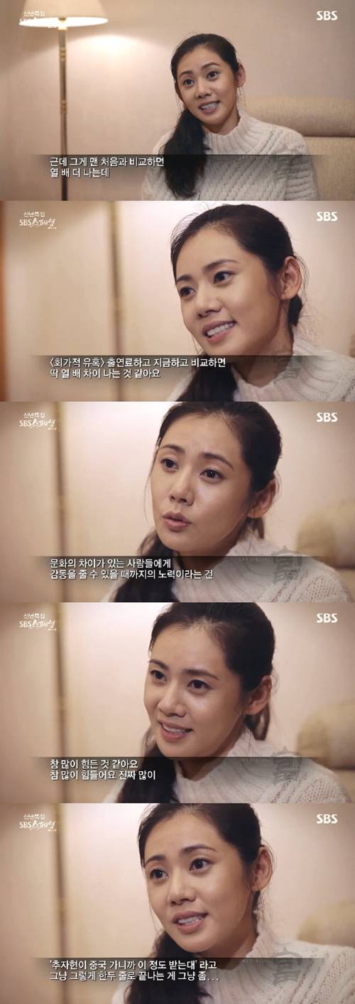 이어 추자현은 "문화의 차이가 있는 사람들에게 감동을 줄 수 있을 때까지의 노력이라는 것은 참 많이 힘든 것 같다. 그런데 그게 한국 분들에게 그냥 단순히 '추자현이 중국 가니 이정도 받는대'라고 그냥 그렇게 한 두 줄로 끝나는 게 좀"이라며 과정보다 결과에만 집중되는 것에 아쉬움을 드러냈다.