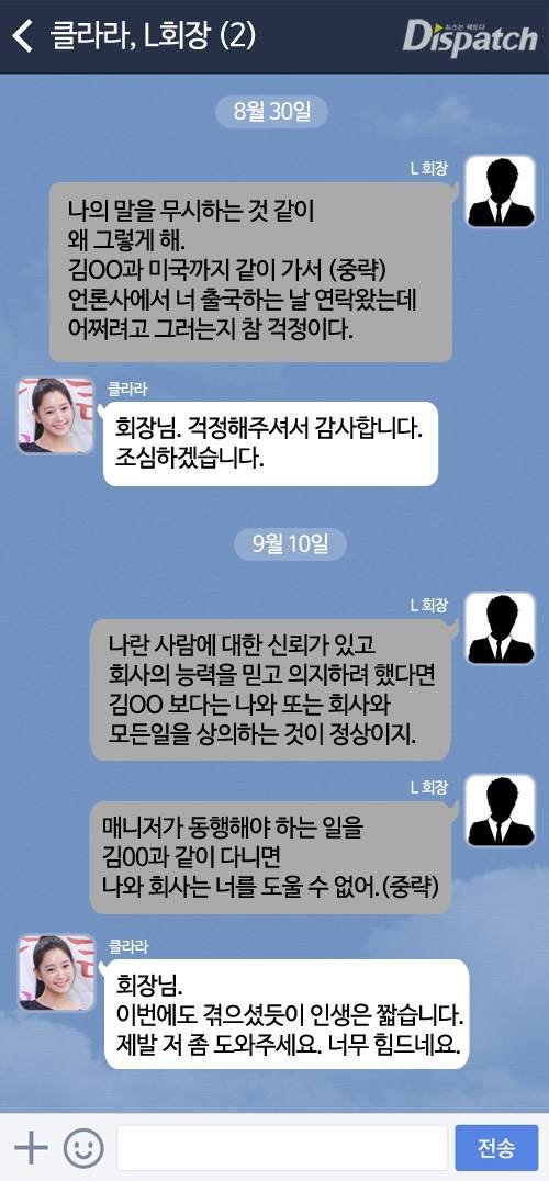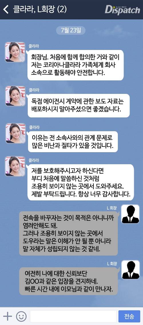 '디스패치'는 클라라와 이 회장이 나눈 SNS 문자 메세지를 확인했다. 계약 단계의 화기애애함, 계약 과정의 의견 차이, 계약 이후의 갈등 등을 엿볼 수 있었다.