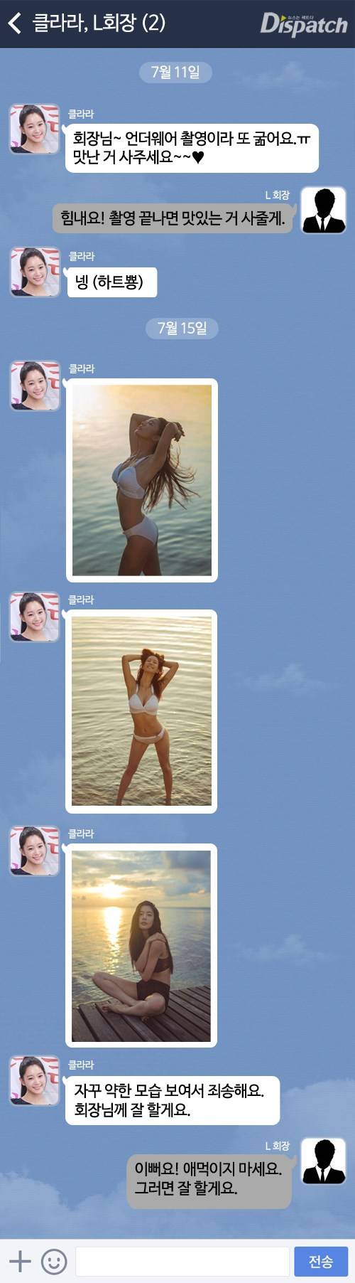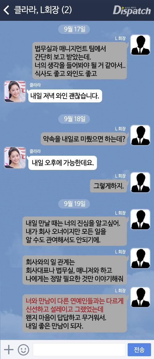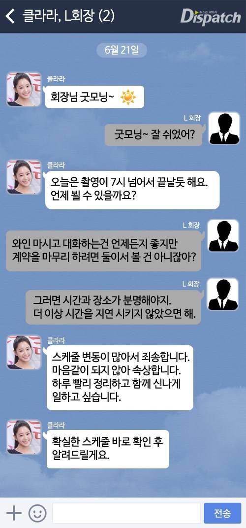 당시 5월 말은 클라라와 이 회장이 전속계약을 앞두고 몇 차례 미팅을 가진 후였다. 클라라는 헤어진 이후에는 '멋지다'라는 문자를 통해 만남의 소감을 전했다.