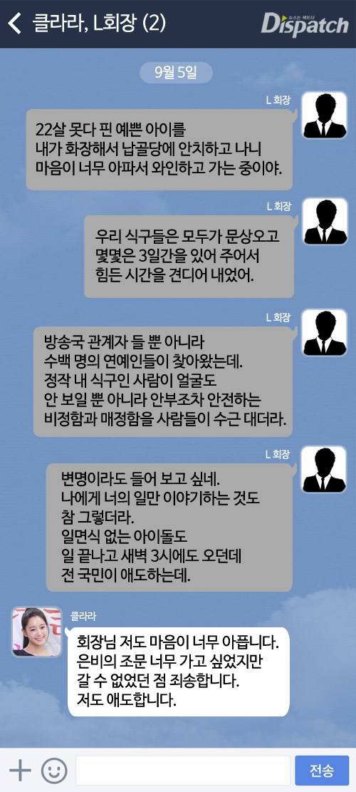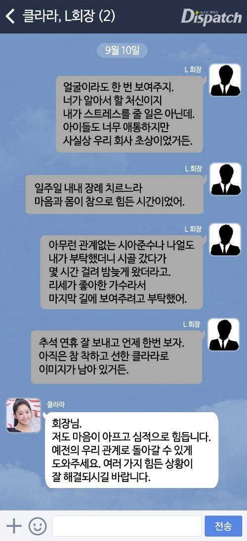 이 회장은 클라라와의 틀어진 관계를 바로 잡기 위해 만남을 제안했다. 그러면서 클라라에게 "너와 만남이 다른 연예인들과 달리 신선했는데 지금은 답답하구나"라고 문자를 보냈다.