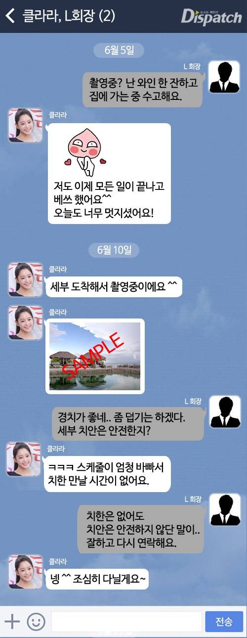 해외 출장을 갔을 때도 마찬가지. 클라라는 이 회장에게 세부 촬영 소식을 알렸다. 이후 현지 사진을 보내기도 했다. 이 회장 치안을 걱정했고, 클라라는 조심하겠다고 답변했다.