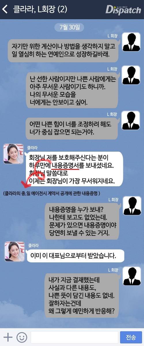 심지어 폴라리스는 클라라에게도 '내용증명'을 발송했다. 中日 에이전시 관련 내용을 공개하라는 것. 그도 그럴 것이 클라라는 중국과 일본 에이전시 계약서를 차일피일 미루었다.