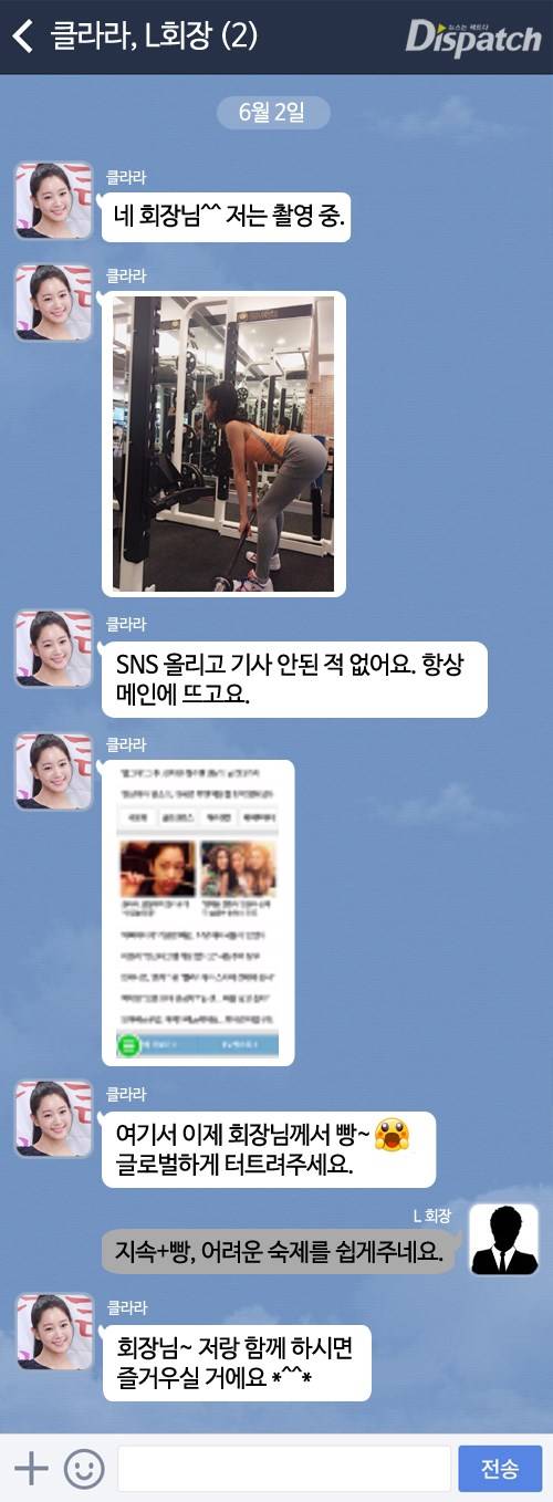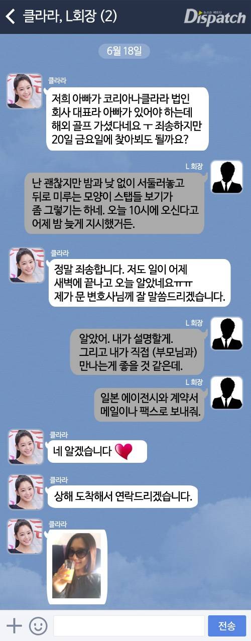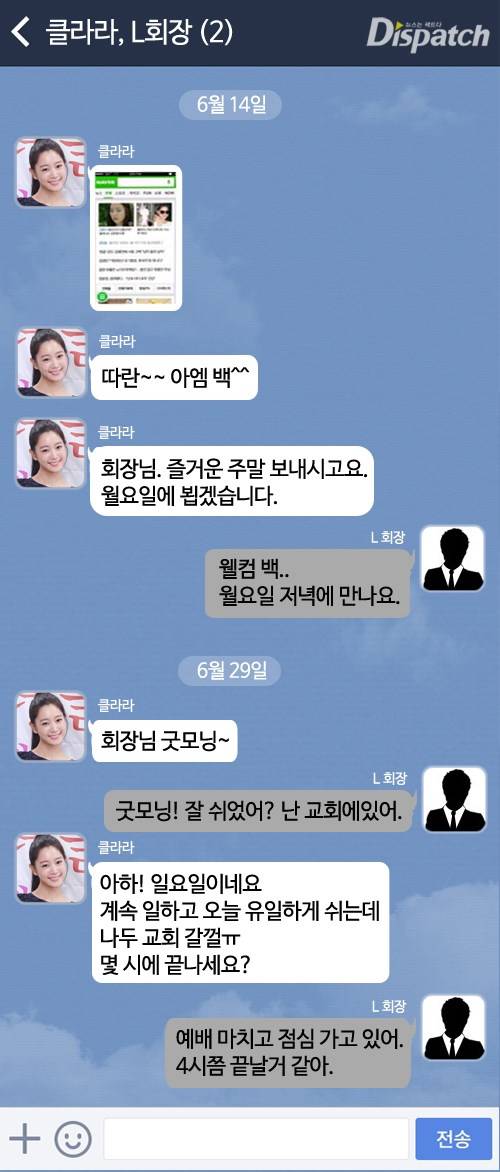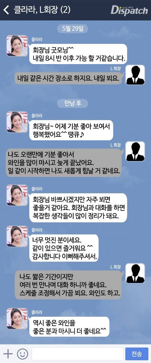 당시 5월 말은 클라라와 이 회장이 전속계약을 앞두고 몇 차례 미팅을 가진 후였다. 클라라는 헤어진 이후에는 '멋지다'라는 문자를 통해 만남의 소감을 전했다.