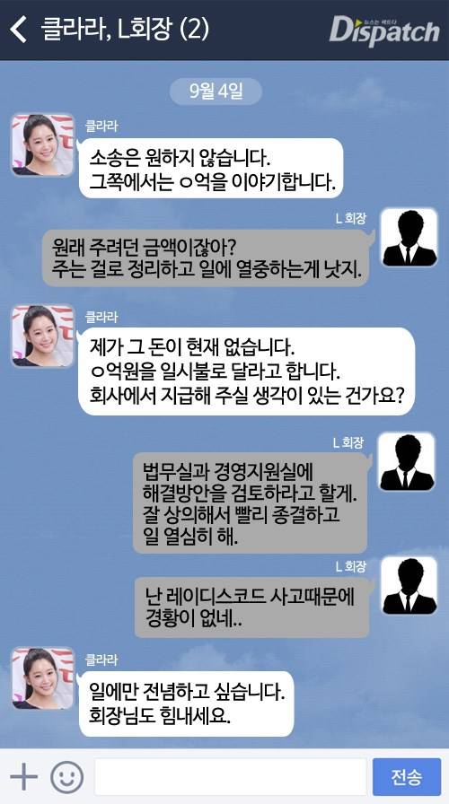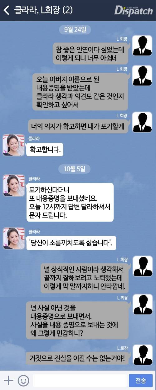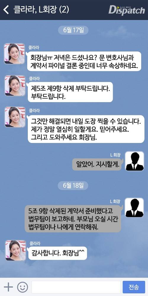'디스패치'는 클라라와 이 회장이 나눈 SNS 문자 메세지를 확인했다. 계약 단계의 화기애애함, 계약 과정의 의견 차이, 계약 이후의 갈등 등을 엿볼 수 있었다.