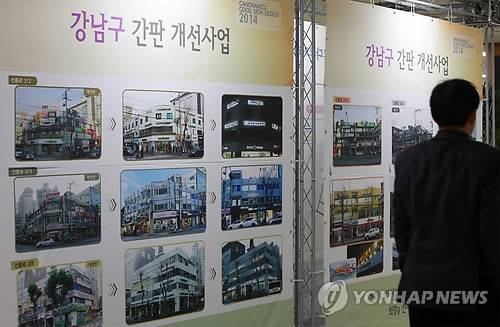 (서울=연합뉴스) 박동주 기자 = 19일 오후 서울 강남구청 로비에서 열린 '간판개선사업 우수사례 전시회'에 개선 전후 모습을 비교한 사진 등이 전시되어 있다. 2015.1.19