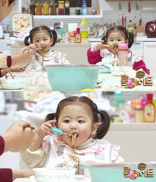 이날 처음에 낯을 가리던 라희-라율이는 금세 룸메이트 숙소에 적응해 짜장면 폭풍 먹방을 선보여 웃음을 자아냈다. 라희-라율이는 입 주위에 짜장면 소스를 잔뜩 묻혀가며 즐거운 식사시간을 보냈다.