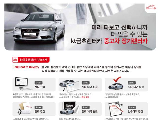 kt금호렌터카의 R2B 서비스는 중고차 장기렌트 계약 전 3일 동안 시승대여를 통해 원하는 차량의 상태를 직접 점검하고 최종 선택할 수 있는 차별화된 중고차 장기렌터카 서비스이다.