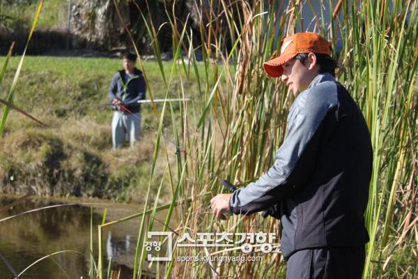 미국 플로리다 베로비치에 위치한 히스토릭 다저타운에서 보름째 훈련중인 SK 윤희상(30)은 낚시라는 취미를 살려 휴식일을 보낸다. 평소에도 마음이 차분해지고, 생각이 정리되는 느낌 때문에 낚시를 즐겨하게 된 윤희상은 스프링캠프 휴식일에도 친한 선수들과 낚시터를 찾곤 한다. 마침 플로리다 캠프 숙소에서는 5분 정도만 걸으면 낚시가 가능한 호수가 있다. 지난달 30일 휴식일에도 김광현·정우람·이상백 등과 함께 낚시대를 들었다. 4명이 1시간 가량 낚시를 하면서 총 3마리를 낚았다. 윤희상은 이날 35㎝의 배스를 잡았다. 이상백은 조금 더 큰 42㎝ 배스를 잡았다. 윤희상은 "상백이는 낚시를 정말 좋아한다. 지식도 많다"고 했다.