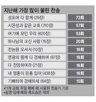 국민일보는 지난달 31일부터 2일까지 주요 교단 및 지역별 중·대형 교회 11곳의 인터넷 홈페이지에 실린 교회 주보를 통해 지난해 주일예배 때 사용된 찬송가를 분석했다. 조사 대상 교회는 광주동명교회(대한예수교장로회 합동), 대구제일교회(통합), 대전 새로남교회(합동), 명성교회(통합), 부산 제일감리교회(기독교대한감리회), 분당한신교회(한국기독교장로회), 사랑의교회(합동), 신촌성결교회(기독교대한성결교회), 아현감리교회(기감), 여의도순복음교회(기독교대한하나님의성회), 지구촌교회(기독교한국침례회) 등이다.