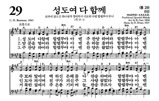 국내 주요 교회에서 지난해 주일 예배 때 부른 찬송 가운데 가장 많이 애창한 곡은 '성도여 다 함께'(새찬송가 29장)인 것으로 집계됐다. 또 새찬송가 645곡 가운데 한 번도 부르지 않은 찬송가는 299곡(46.4%)으로 절반에 가까웠다.