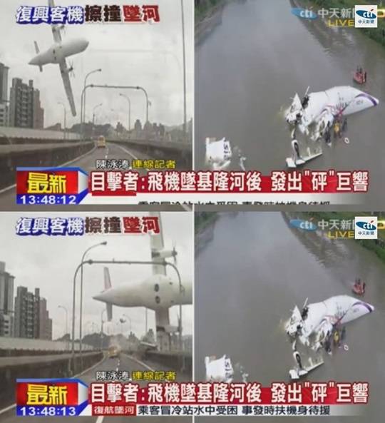 타이완 CTI 뉴스에 따르면 대만 비행기 한 대가 4일 이륙 직후 고가도로를 들이받고 추락해 여러 사상자를 냈다. 알려진 바로는 현재까지 대만 비행기 추락 사고 사망자는 10여 명이고, 부상자는 20여 명에 이른다.