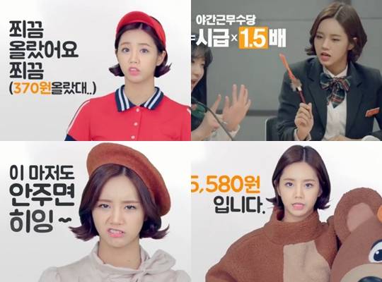 혜리는 광고에서 "사장님들, 대한민국 알바들의 야간근무수당은 시급의 1.5배. 안 지키시면 으~응. 협박 아님. 걱정돼서 그럼", "알바 여러분. 법으로 정한 대한민국 최저시급은 5580원입니다. 5580원 이런 시급. 쬐끔 올랐어요 쬐끔. 370원 올랐대. 이마저도 안주면 히잉~", "알바 여러분. 알바를 무시하는 사장님께는 앞치마를 풀러 똘똘 뭉쳐서 힘껏 던지고 때려치세요. 시급도 잊지 말고 챙겨나가세요"라는 등의 말을 한다.
