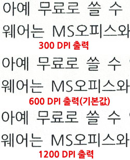 출력 품질을 살펴보니 글자의 외곽선에 아주 약간의 번짐이 느껴지긴 하지만, 자세히 보지 않는 이상 눈에 거슬릴 정도는 아니다. 기본값인 600 모드보다 고품질인 1200 DPI 모드에선 어느 정도 나아지긴 하지만 고품질일수록 토너의 소모량이 증가한다는 것을 생각해 본다면 굳이 1200 DPI 모드를 쓸 필요는 없을 것 같다. 사실, 어지간히 까다롭지 않은 사용자가 아니라면 300 DPI 수준으로도 크게 불만은 없을 것이다.