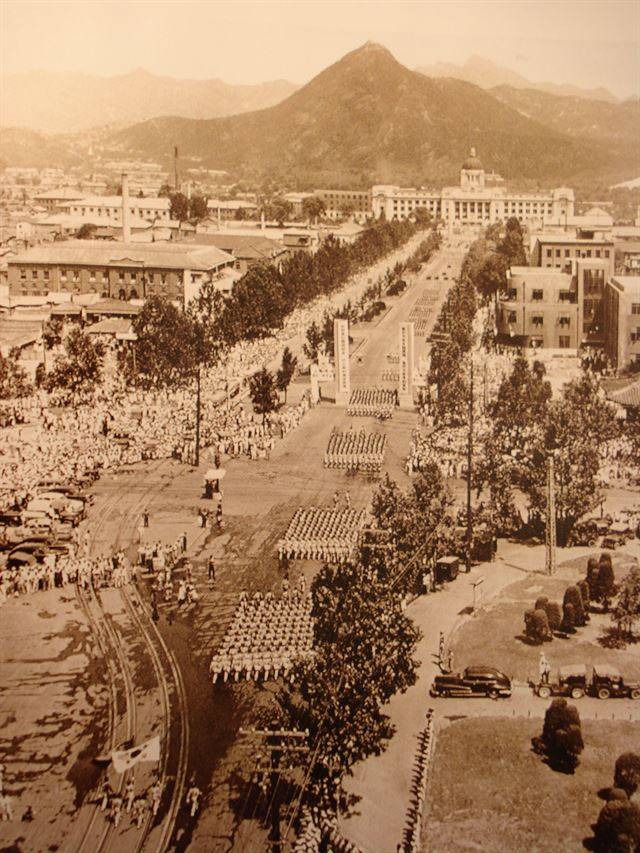 대한민국 건국 1주년을 맞은 1949년 9월 한국 육군과 해안경비대가 일제 식민지배의 상징인 옛 조선총독부 건물로 통하는 광화문 대로에서 행진하고 있다.
