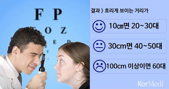 1. 한 손에 자를 잡고 얼굴에서 자가 뻗어나가도록 한다.2. 다른 손에는 명함을 쥔다.3. 명함을 눈 바로 앞에서부터 천천히 멀리 내밀어본다.4. 명함의 글씨가 선명히 보이는 지점에서 멈추고 거리를 잰다.5. 눈의 신체나이가 젊을수록 가까운 것은 잘 보이고 먼 것은 잘 안 보이는 반면, 노안일수록 가까운 것은 안 보이고 먼 것은 잘 보이는 원시가 된다.