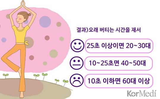 1. 두 눈을 감고 양 무릎을 45도 정도 구부린다.2. 양 손은 허리에 고정하고 왼발을 바닥에서 15cm 정도 들어올린다.3. 이 자세를 시작한 뒤 균형이 흔들려 눈을 뜨거나 오른발을 움직일 때까지 걸리는 시간을 잰다.4. 5분 간격으로 3회 측정해 평균값을 낸다.5. 시간이 짧을수록 균형 감각이 떨어진다.