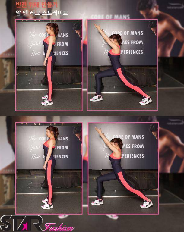 - 양발을 어깨넒이로 곧게 선다. 호흡을 내쉬며, 양팔을 앞으로 곧게 뻗어주며, 오른쪽 다리를 길게 뒤로 뻗어준다. 다시 호흡을 들이마시며 동작을 원위치하고 왼쪽다리도 마찬가지로 실시한다. 번갈아가며 총 20회 실시한다.