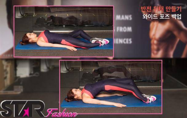 - 누운 상태에서 양무릎을 접고 발바닥이 마주볼 수 있도록 무릎을 바깥쪽을 유지한다.양무릎은 최대한 지면과 가깝게 유지시켜 주며, 호흡을 내쉬며 허리를 들어준다. 다시 호흡을 들이마시며 허리를 내려준다. 이때 허리는 지면에 닿지 않는다. 동작횟수는 처음에 허리를 올린 상태에서 10초를 유지한 후 내려주고 그 후 반복 횟수 20회를 실시한다. 총 3세트 진행해준다.