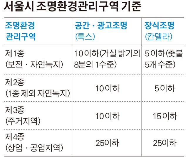 별도로 장식조명의 경우에는 1ㆍ2종 지역에선 5칸델라 이하, 3종 지역은 15칸델라 이하, 4종 지역에선 25칸델라 이하를 적용해야 한다. 1칸델라는 촛불 한 개의 밝기 수준이다.