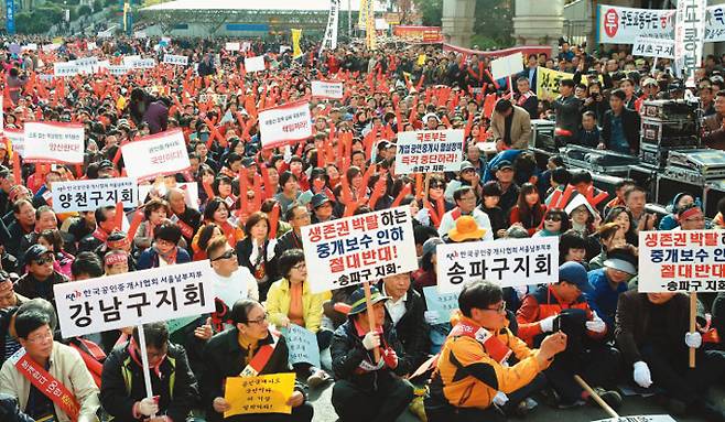 ↑ 2014년 11월 서울 용산구 서울역광장에서 공인중개사들이 국토교통부의 부동산 중개보수 체계 개편에 반대하는 집회를 열고 있다. |