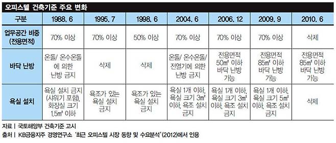 법률상 '사무실' 취급을 받는 오피스텔이 이처럼 사실상 '주택'의 설비를 갖추게 된 건 정책의 영향이 크다. 정부는 1988년 6월 오피스텔 건축기준을 고시하면서 업무공간 비중이 전체의 70% 이상 될 것을 요구했다. 욕조 및 바닥 난방용 설비도 금했다. 주거용으로 사용하는 걸 막기 위해서다. 그러나 정부 정책은 2000년대 들어 전환을 맞는다. 1~2인 가구 확대로 소형주택 수요가 늘자 오피스텔을 주거용으로 활용할 길을 열어준 것이다. 2006년 바닥 난방을 허용했고, 2010년부터는 업무공간 비중 제한과 욕조 제한도 없앴다(표 참조). 문제는 건축법상 지위는 달라지지 않았다는 점이다. 민태욱 한성대 부동산학과 교수는 이에 대해 "오늘날 대부분 오피스텔이 주거용으로 건설되고 공급되는데도 법률적으로는 업무시설 취급을 하는 바람에 법체계에 혼동이 생기고 있다"고 지적했다.