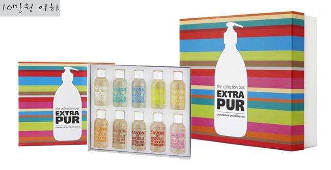 예쁜 포장으로 주는사람과 받는 사람을 모두 기분좋게 만드는 엑스트라 퓨어 컬렉션박스는 50ml 샤워젤이 향기별로 총 10pcs 들어있다. 이 제품이 특별한 이유는 엑스트라 퓨어라인의 10가지 향(메디테리안, 올리브&라벤더, 피그, 오렌지 블라썸, 와일드 로즈, 체리블라썸, 프레시버베나, 스위트 바이올렛, 썸머 그레이프 프룻, 민트티, 코튼 플라워)을 모두 만나볼 수 있다는 데에 있다. 컬러풀한 용기로 인테리어 효과까지 얻을 수 있는 컬렉션 박스는 센스있는 명절선물을 찾는 이들에게 추천한다.