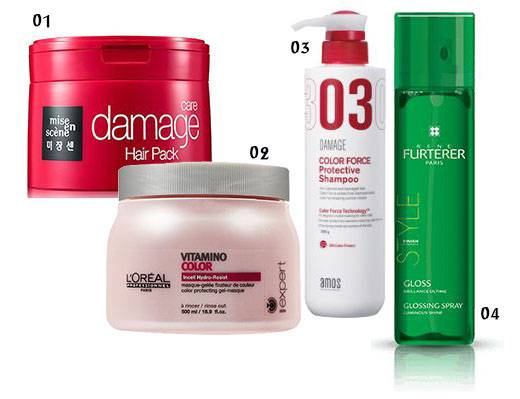 : 모발에 집중적으로 영양을 공급해 트리트먼트 지속효과를 높인다. 아르간오일이 열로 손상된 모발을 보호하고 엉킴 없이 매끈한 머릿결을 만든다. 02.로레알 비타미노 컬러 마스크: 샴푸 후 모발에 바르는 헤어 마스크. 염색으로 인한 손상모발을 집중 개선하고 물 빠짐을 줄여 선명한 컬러감을 유지한다. 03.아모스 칼라포스 프로텍티브 샴푸: 모발의 큐티클을 수축시켜 컬러 지속력을 강화하는 산성샴푸. 부드러운 세정으로 과도한 물 빠짐을 방지하고 오염물질에 의한 퇴색을 막아준다. 04.르네휘테르 글로싱 스프레이: 스타일링 마무리 제품으로 거울과 같이 반짝이는 스타일링을 선사한다. 매니큐어 효과로 컬러 광택을 증가시키고 수분을 오래 유지하도록 돕는다. (사진출처: 로레알, 폴미첼, 엘라스틴, 러쉬, 미쟝센, 아모스프로페셔널, 르네휘테르, bnt뉴스 DB)