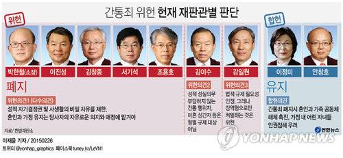 이들 재판관은 "세계적으로 간통죄가 폐지되고 있는 가운데 간통죄에 대한 국민의 인식이 더 이상 일치하지 않는다"며 혼인과 가정의 유지는 당사자의 자유로운 의지와 애정에 맡겨야 한다"고 강조했다.